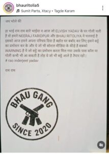 गैंग द्वारा जारी पोस्ट में लिखा गया कि एल्विश यादव ने बेटिंग एप का प्रचार कर कई परिवारों को बर्बादी की ओर धकेला है। यही वजह है कि उनके घर को निशाना बनाया गया। गैंग ने चेतावनी भी दी कि जो भी लोग सट्टे का प्रमोशन करेंगे, उन्हें कभी भी कॉल या गोली मिल सकती है।