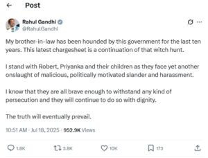 कांग्रेस सांसद राहुल गांधी ने ‘एक्स’ पर किेए गए पोस्ट में कहा कि ,केंद्र की बीजेपी सरकार पिछले दस सालों से उनके बहनोई को परेशान कर रही है । यह नवीनतम आरोपपत्र षडयंत्र उसी षडयंत्र का हिस्सा है। राहुल गांधी ने कहा कि रॉबर्ट, प्रियंका और उनके बच्चों के साथ हैं। क्योंकि उन्हें दुर्भावनापूर्ण, राजनीतिक रूप से प्रेरित बदनामी और उत्पीड़न का एक और हमला झेलना पड़ रहा है। राहुल गांधी ने कहा कि मुझे पता है कि वे सभी किसी भी तरह के उत्पीड़न का सामना करने के का साहस रखते हैं और वे गरिमा के साथ ऐसा करते रहेंगे। और अंत में सच्चाई की जीत होगी।